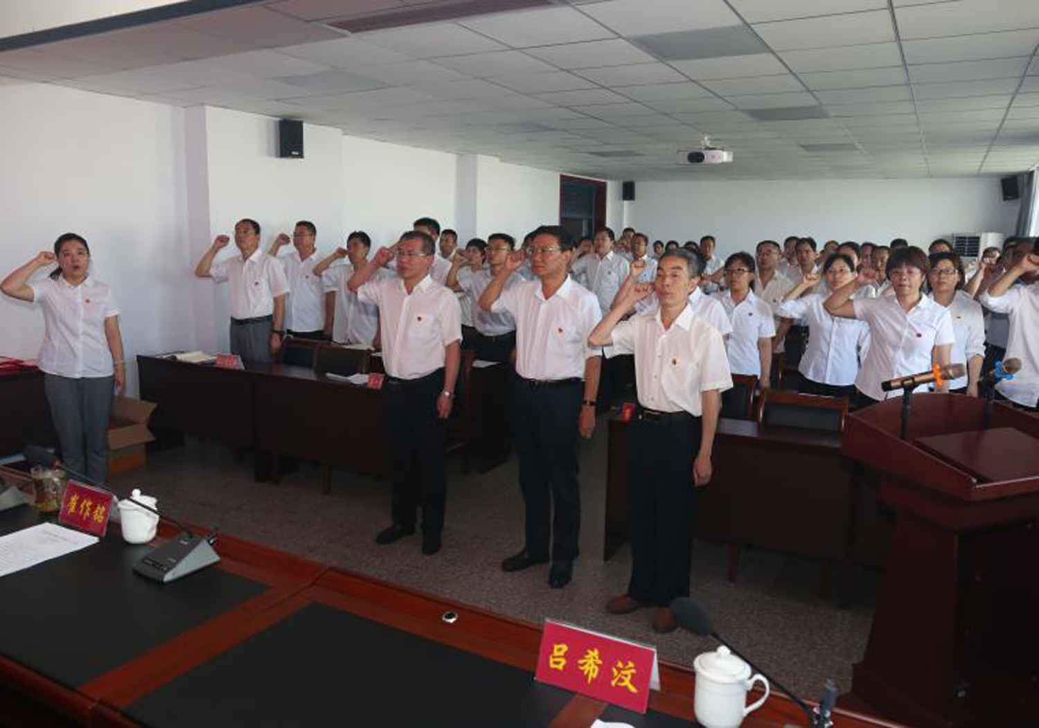 大會(huì)在雄壯的國(guó)歌聲中拉開(kāi)帷幕,黨委辦公室主任郝麗娜同志領(lǐng)誓,全體黨員面對(duì)黨旗,共同重溫了入黨誓詞。