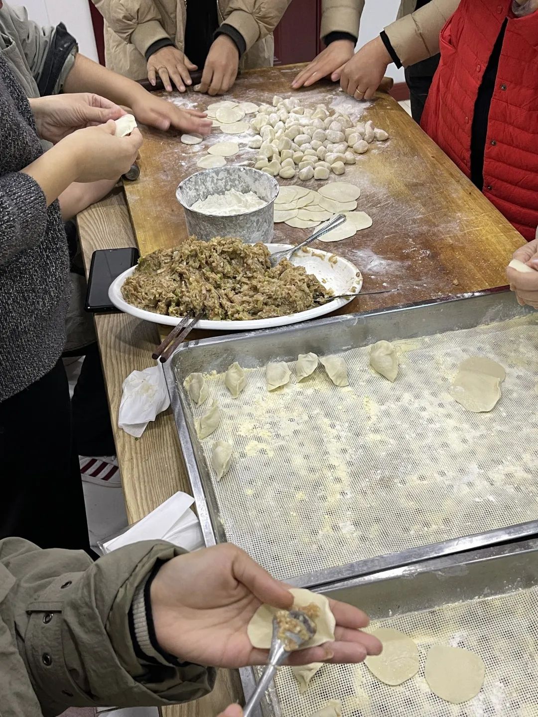 大家一起圍在桌旁,分工有序、忙而不亂,互相交流著包餃子的技巧,歡聲笑語中各個(gè)大顯身手,現(xiàn)場氣氛和諧,到處洋溢著“家”的味道、“家”的溫馨。一番協(xié)作之下,一排排個(gè)性十足的餃子很快就包好了,屋外寒風(fēng)陣陣,屋內(nèi)歡聲笑語,暖意融融。