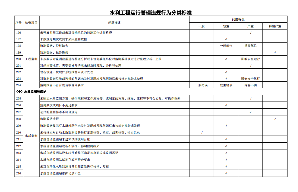 第六條 水利工程運(yùn)行管理問題包括運(yùn)行管理違規(guī)行為和工程缺陷。