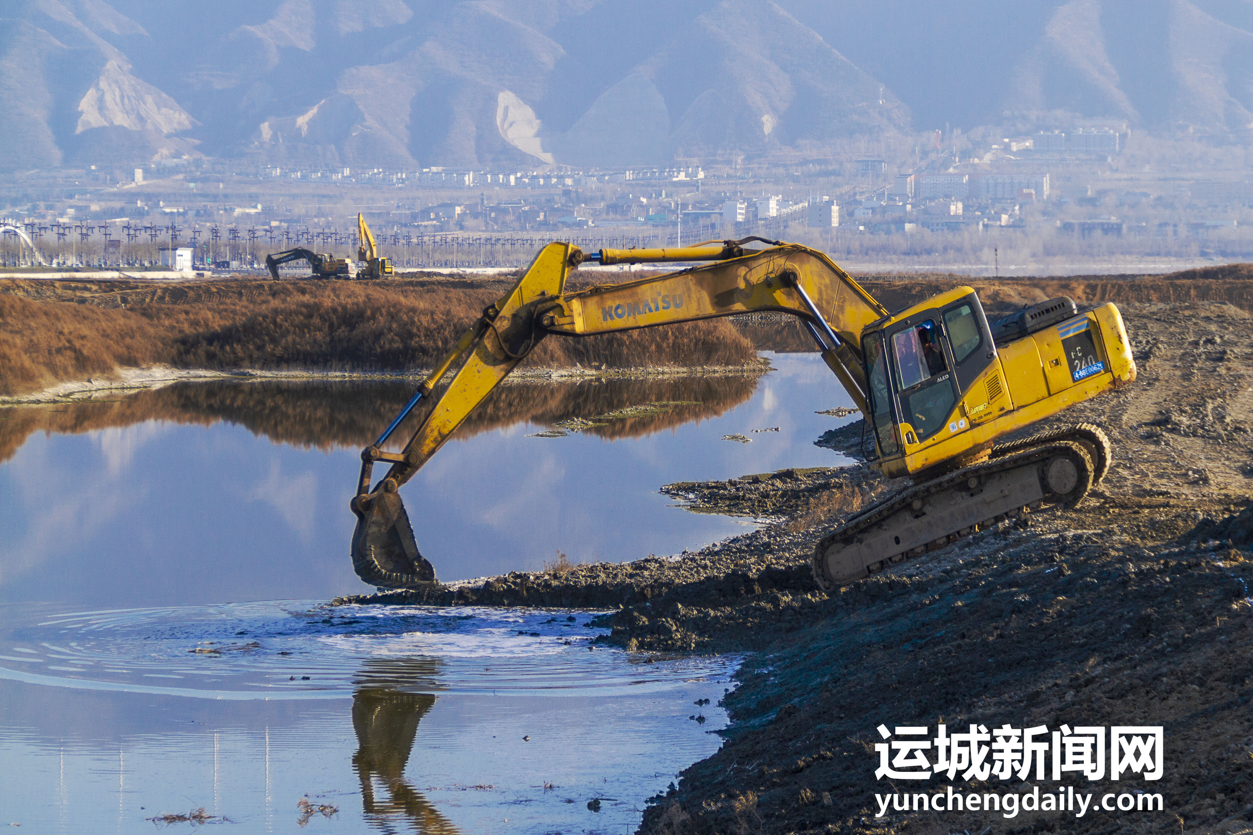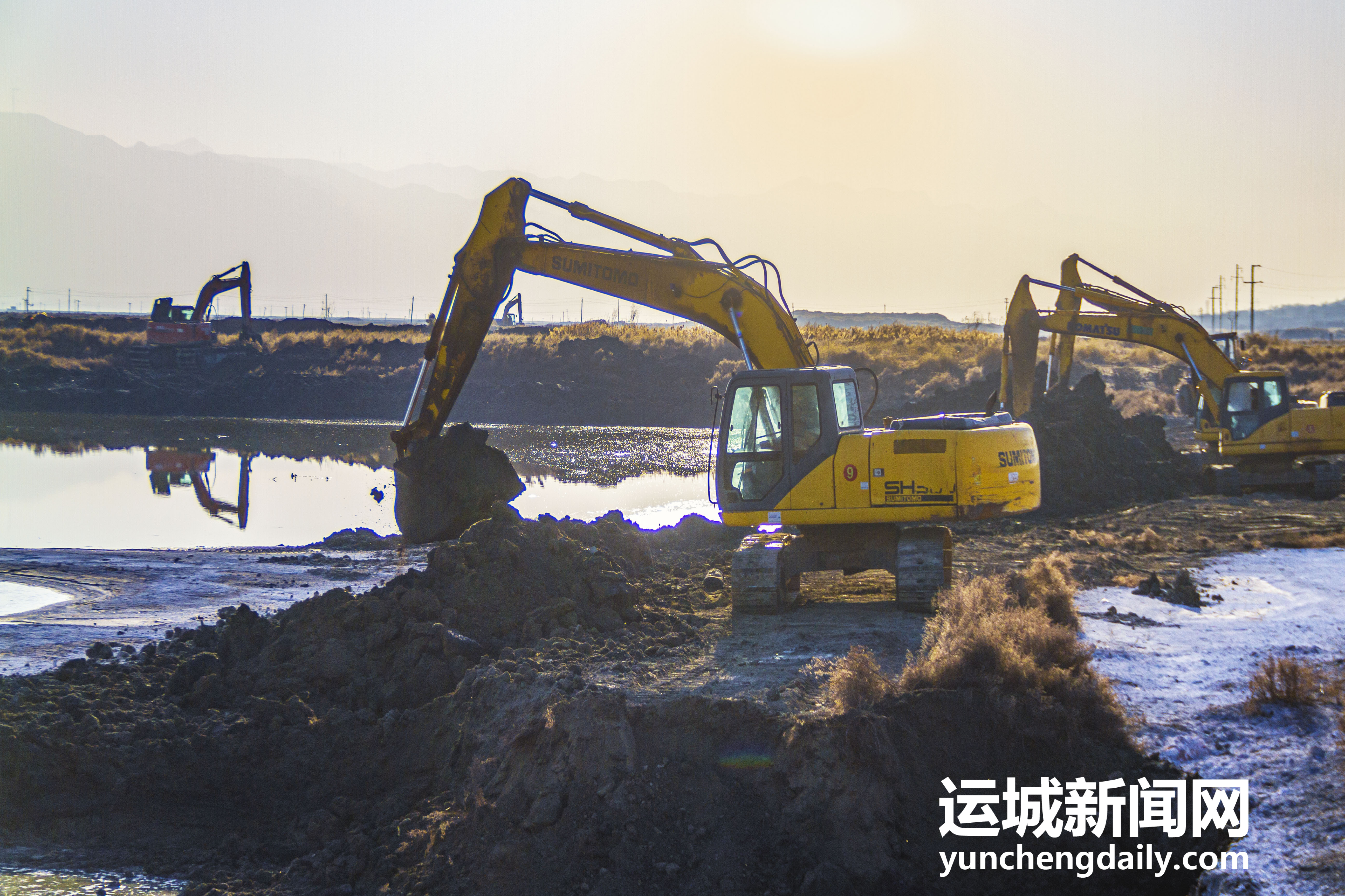 2022年12月18日,鹽湖景區(qū)內(nèi),工人師傅正在對堤埝進(jìn)行除險(xiǎn)加固。 特約攝影 姜樺