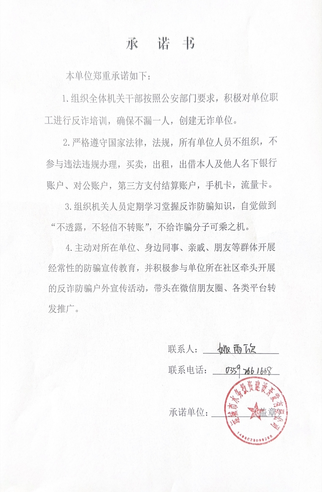運(yùn)城水投公司反詐承諾書(shū)