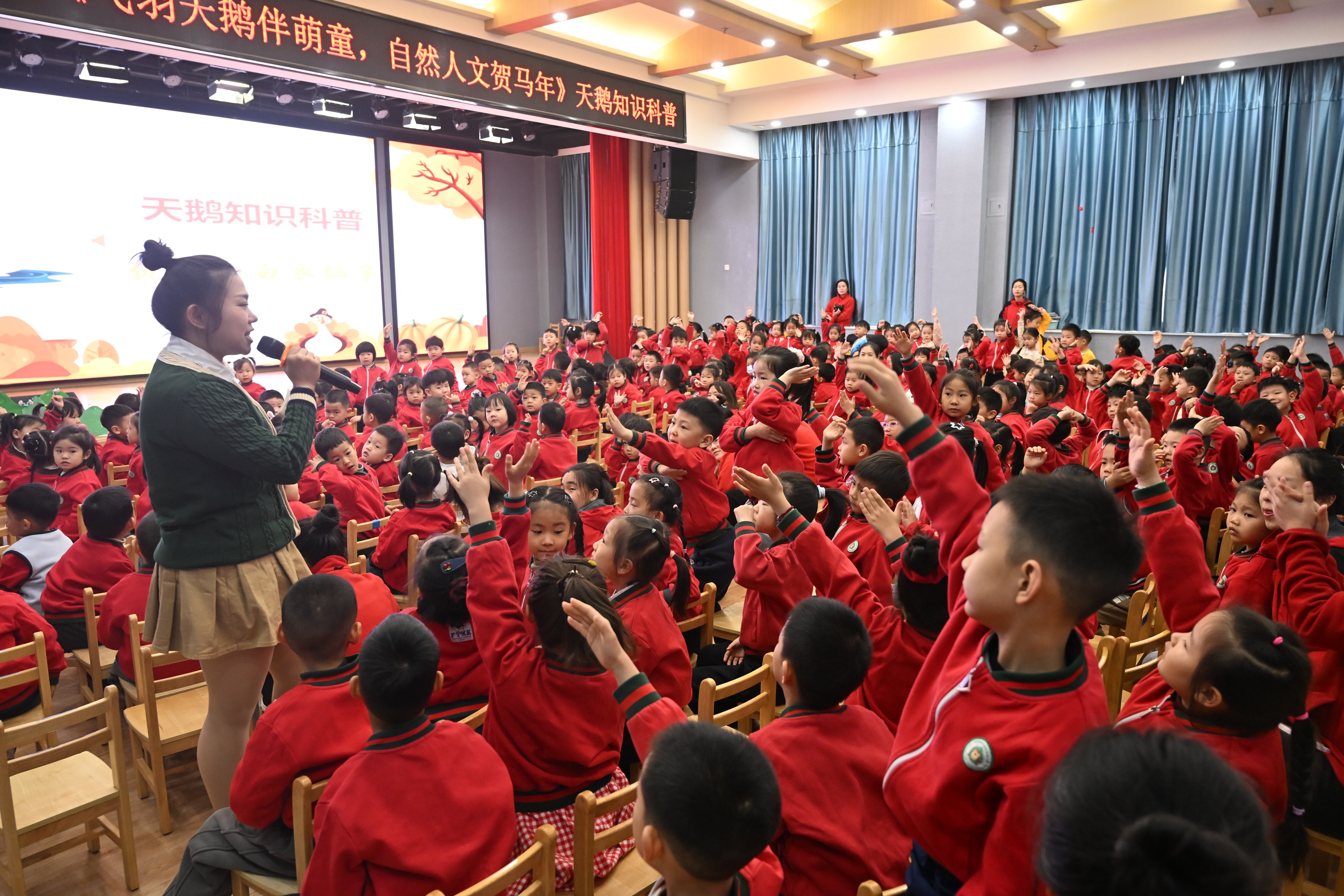 課堂上,水投文旅工作人員借助精美的圖片、生動的視頻,深入淺出地講解天鵝的生活習(xí)性、棲息環(huán)境以及面臨的生存挑戰(zhàn)。孩子們睜著好奇的眼睛,沉浸在天鵝的世界里。互動環(huán)節(jié)中,他們積極踴躍,提出一個個充滿童趣又富有思考的問題,展現(xiàn)出對生態(tài)保護的濃厚興趣。
