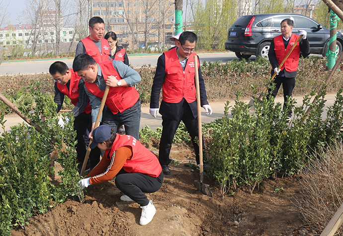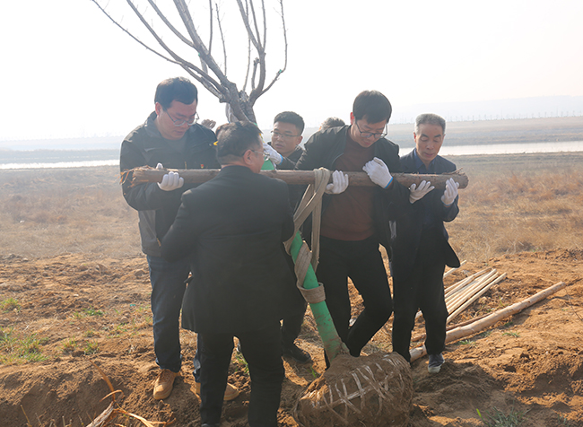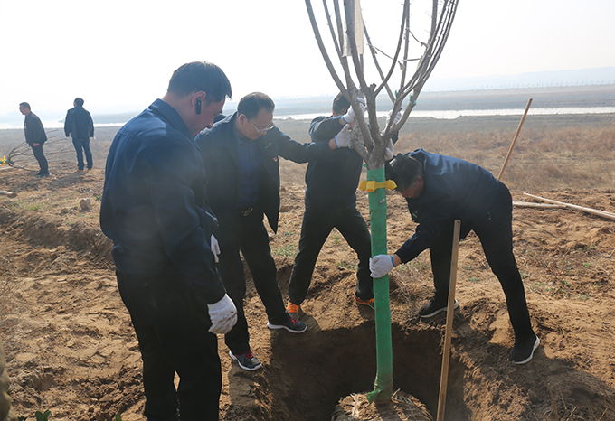 植樹現場,公司志愿服務隊揮鍬培土、提水澆苗,一派繁忙的勞動景象,大家相繼栽下大葉黃楊地苗5000余株,為山西稷山汾河國家濕地公園的春天增添了一片生機。