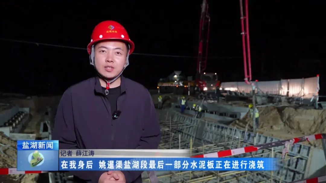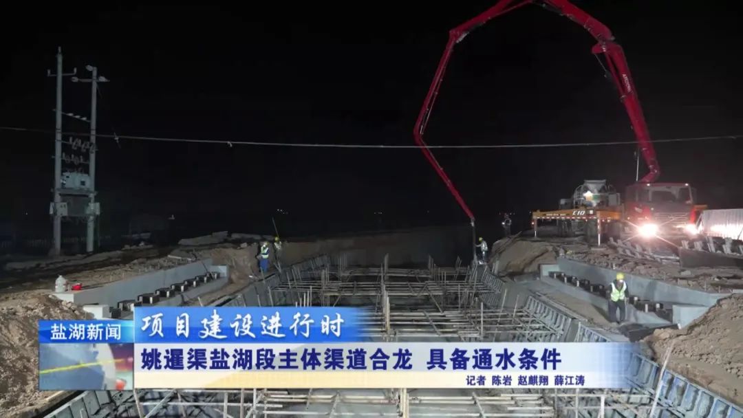 現(xiàn)在是4月28日晚上11時(shí)30分,在我身后,姚暹渠鹽湖段最后一部分水泥板正在進(jìn)行澆筑。澆筑完成后,全長24.9公里的姚暹渠鹽湖段主體渠道將實(shí)現(xiàn)合龍,形成完整的過水通道,標(biāo)志著工程迎來關(guān)鍵的階段性勝利。